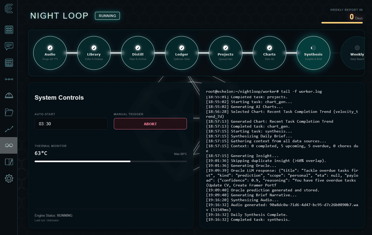 Echelon is a personal, local-first system designed to manage tasks, habits, and long-term maintenance without relying on cloud services. The project focuses on building a reliable, always-available system that integrates software architecture, automation, and user-facing interfaces.