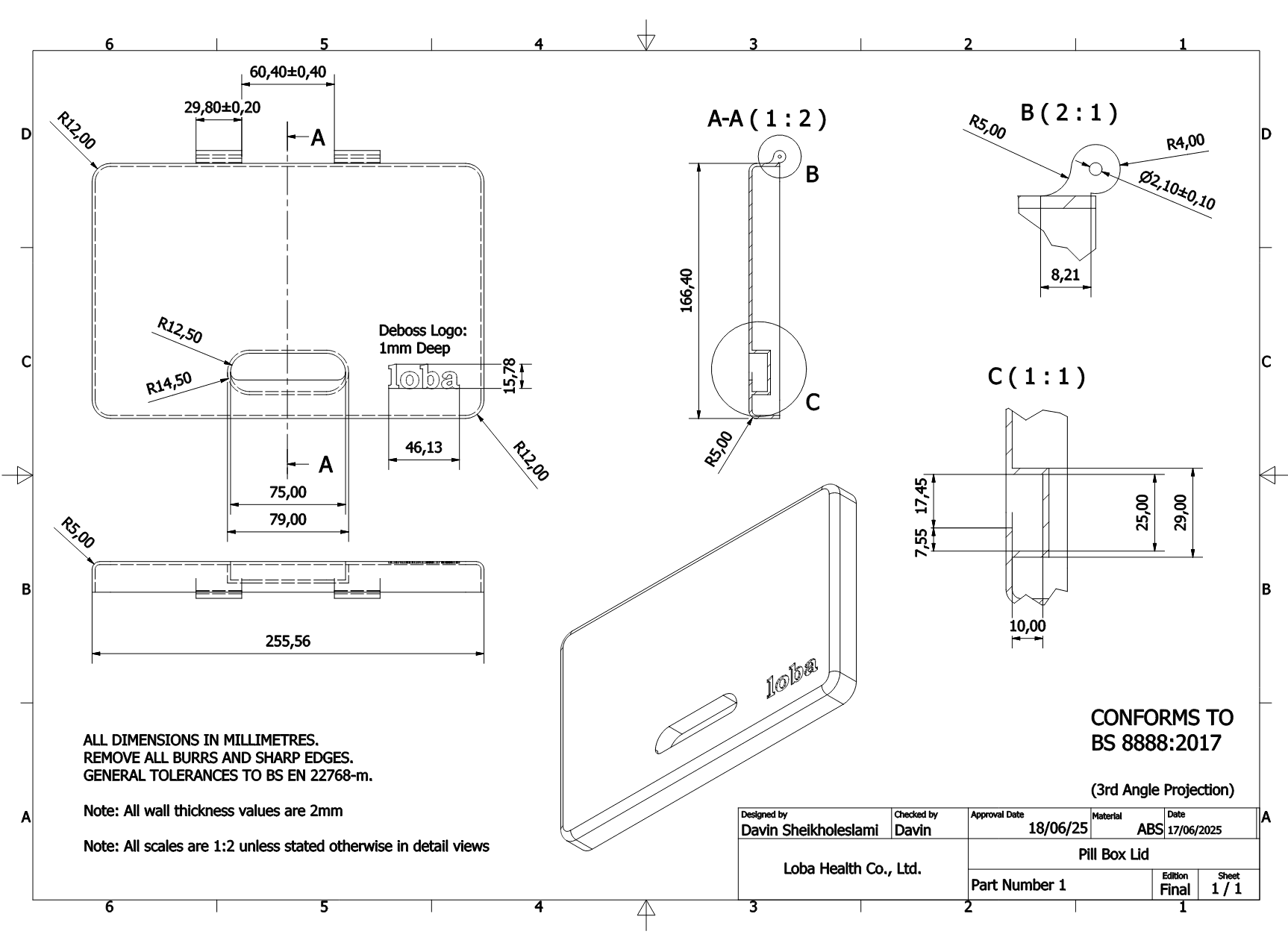 PillMate is a compact group product design project focused on form factor development, professional CAD modelling, and technical documentation. The work centres on designing a clear, manufacturable enclosure and producing detailed drawings suitable for communication with engineers or manufacturers.